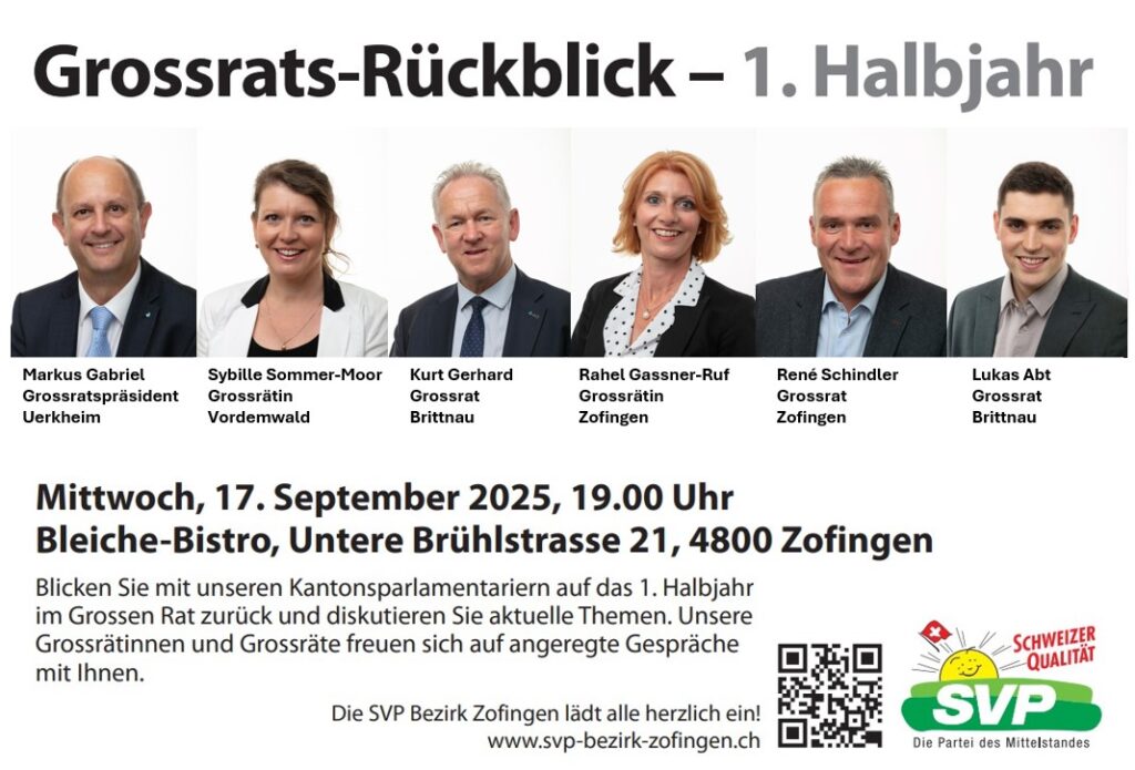 Die Parteibasis der SVP Bezirkspartei Zofingen nominierte auch die 15 Grossratskandidatinnen und Kandidaten für die Grossratsliste. Von den bisherigen Grossräten tritt einzig Stefan Giezendanner wegen Wegzug aus dem Bezirk nicht mehr an. Mit Christian Glur, Markus Gabriel, Sybille Sommer-Moor und Kurt Gerhard stellen sich vier Bisherige für eine erneute Wahl. Neben diesen ausgewiesenen und kompetenten Persönlichkeiten, die ihre Aufgaben in den vergangenen Legislaturperioden vorbildlich wahrgenommen und sich für die Anliegen einer breiten Bevölkerungsschicht verdient gemacht haben, kandidieren auch unverbrauchte und bestens qualifizierte Kräfte. Darunter erfreulicherweise mit Rahel Gassner (Zofingen) auch eine zweite Frau.